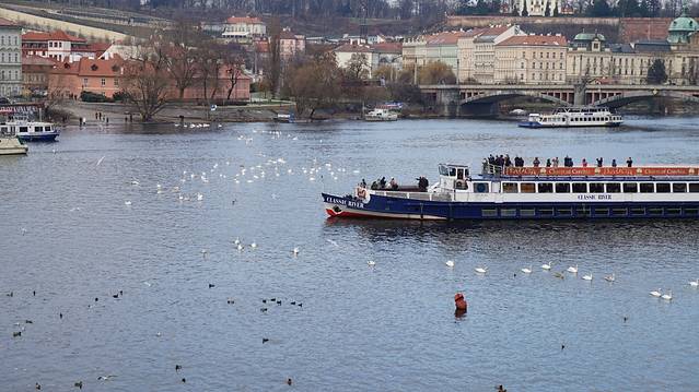 桥下伏尔塔瓦河,河上面的观光船,还有成群的鸽子和野鸭,美极了