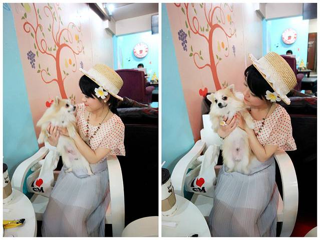 然后就遇见了这货,他可比自己主人热情的多。特别是钻进两个女生怀里就不肯下来,艾玛这豆腐吃的。我说这猥琐狗狗叫啥名儿啊?老板说:老T。