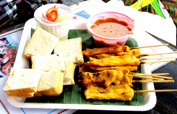 沙爹猪肉串~这个好吃,首先点上酱汁,然后把猪肉串夹到面包中去,好吃~猪肉做的很嫩不柴