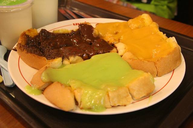 土司全部都是现场放到烤炉上重新加热的,软香热,酱也是现场一直一大锅在煮的,我们试了三个味道,巧克力花生还有一个绿色的不知道什么酱。大力推荐巧克力酱哟,很好吃!绿色的我是里面最不喜欢的了。