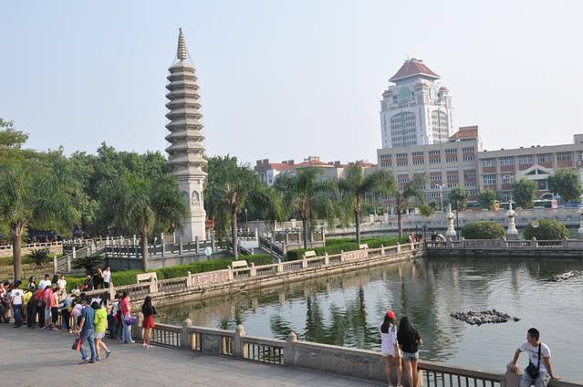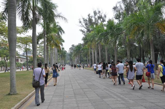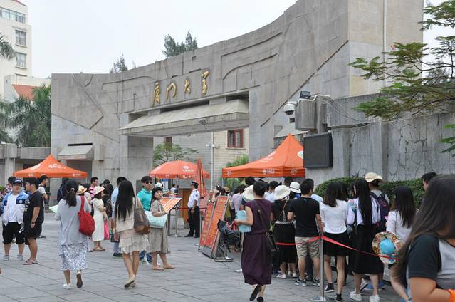 有名的骑行环岛路被我们三个人沿着海边步行走到了厦大科技园,途径白鹭艺术中心,海边广场。。。。路标导模糊,让我们把科技园当做厦大走进去,还庆幸没有门卫。走了一段问了学生知道错啦啦。看着还有半小时12点,我们打车去的厦大本部。公交两站路程被出租车司机带着绕道有名的武大桥。到校门口就有几十米的队伍,我们最后的三个人十几分钟后又排了很长。厦大限制进入游客,总担心我们进不去,没想到很庆幸的哈哈。刷身份证拍正脸照进入校园如释负重呀。好奇怪。别致的校园建筑很是吸引我们的眼球。都感叹道:这能专心上课吗?怎么,我就没有好好上学,天天向上呢?这么美好的校园,走路好累丫丫!我们的导航“李大锤”总是能让我们回头再回头,一段路重复了三次。午餐在芙蓉餐厅。有句话“中国有芙蓉姐”,“厦门有芙蓉餐厅”。他们点的米饭,我的台湾鱼丸面,不好吃,加了辣椒没有一点辣椒的味道,吃了一半留下了。芒果汁喝着总觉得有柿子的感觉,难道错觉吗?