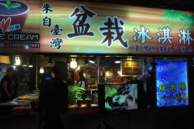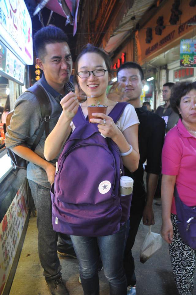 继续步行到台湾小吃街,各种海产品,我点了一份生蚝,10元一份10个。“李大锤”买的秋刀鱼,鸡肉串,快要吃完又来了他那个室友,三人行就变成了四人行。。也加了大龙虾,第二份秋刀鱼。 也不是喜欢生蚝,而是喜欢那个蒜蓉的味道,所以又买了一份,我向 收钱的男孩提出能否多送两个。他欣然同意啦,哈哈。搞笑的是,我嘻嘻哈哈的有说有笑的吃到一半,那个烤生蚝的另一个男孩夹了一个放我碟子里,还没反应过来又夹一个。“神经病”我们都很迷茫,不知道怎么回事,旁边的食客说为什么只给他没送我们呢?结果很明显他们收获了一个赠送的。但是我们加起来多吃了四个。真搞笑的不能行呀。继续前行,就是我好奇的“盆栽冰激凌”~~~巧克力粉铺顶,薄荷叶子般的小草,石头奶糖粒,下面香芋,蓝莓,薄荷,巧克力四种味道冰激凌。为了拍大作,我激动的倾斜着盆栽,上面的“石头”都掉地上了。我问老板“我的石头都掉了,能不能再给我点呀?”,老板又搞笑的操着一口闽南语说“你的石头怎么掉啦?”大家瞬间对我这个“石头”称呼笑的前俯后仰。路过的游客都停下看我们拍照玩耍。转眼间走到街头,“神经病”那句我还没吃晚饭呢?让刚刚吃了一堆小吃的我们瞬间石化啦。所以回住处路上买了粥。考虑到胃承受能力,我的“黄上煌”辣辣鸭架也没有买,明天吧。。。。。又一个小时了过去了,他们三个人在住处聊天去了,我写日志逃跑了。。。