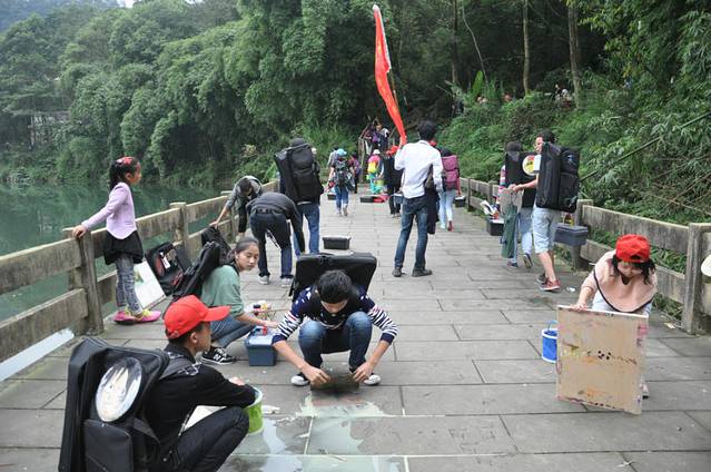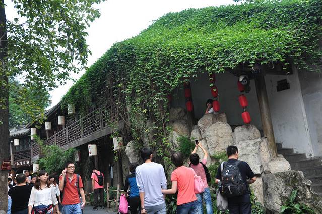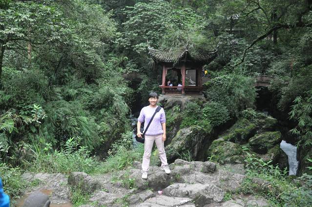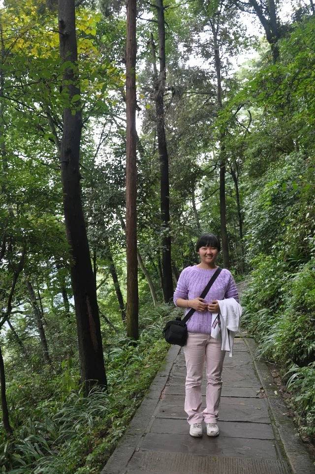 这是个AAAAA景区,但是我以前没有听说过。也是因为来看都江堰觉得很近很方便,一起都走一下的。没想到,这真是个好地方。刚进景区就被各种青绿色吸引。天空还下着小雨,山里湿漉漉的,游客很少,我和刘老师三个人是最早的。一路上也没有见到有几个人。这里的树木,笔直笔直的,而且很高,刘老师说这叫杉树。我只在语文课本听过。台阶没有泰山的光滑,走起来还算安全。中间要经过小湖坐船5块钱到达索道。其间刘老师发现了远处一壁墙面特别像乐山大佛,拍了下来,明天可以对比对比。雨水打在湖面上,很好玩,我特意拍了录像。小船也在雨里悠悠荡荡的抵达对面,刚到地面,就被旁边的桂花香吸引了,还带着雨滴。可惜我的桂树录像在后面不小心删除了。坐着索道上到半腰,继续前行。我也是前晚查了百度知道,青城山是中国道教发祥地之一,是全国道教十大洞天的第五洞天,主峰是老霄顶~~海拔1260米。途中会见到很多道观的,对于我这个毫无宗教佛教信仰的人来说,只是拍景拍物。最喜欢的一段是拍云海。可能我拍照太细致了吧,让刘老师他们这样,那样的站位,被旁边的游客全注意了。结果排队让我给他们拍照。后上来的陌生阿姨见状给同伴说我是摄影的,他们的也让我拍。待所有的都拍完,我们才继续上山。以前,我只知道我那么喜欢淡绿,今天发现竟然对青苔那么感兴趣,无论是屋顶房檐的,树根部的,墙上的,石板路缝隙的,我全都不放过,只要觉得不错,都拍了。我还想着,回家肯定得建个新相册了,名字都想好了,就叫:青青苔。灯笼花整体也不是特别好看,但我想拍个特写,就反复调整镜头,找个最满意的画面的。拍着拍着,飞来个不速之客,像黄蜂,肚子肥嘟嘟的,严重的是这家伙竟然无视我的存在,依旧站在花蕊上狂采蜜。昆虫不好遇,抓拍也难的了,逮着这个机会我肯定得好好利用利用不是。所以咔嚓咔嚓拍了好几张。啊呀呀,真想我的索尼赶紧上传到我的行家精致。再后来,有卖黄瓜,地瓜,西瓜的,和家里的都不一样。看着辣辣的豆腐块,买了五块钱的。刘老师还帮我拍了照。下山时候,我被那朵小黄花吸引的不得了,放手里,放地上,横拍竖拍捯饬了半天,每次左手拿物品,右手拍特写时,左手在忙就无法调节合适的焦距,为了达到满意,这样子试试,那样子调调,忙活的不亦乐乎。在路边捡到谁扔的,我捡起来,玩弄了半天。想着,如果夹在翻开的课本中间,拍照片的话会不会很漂亮呢?可惜后来花瓣掉了一片,我本打算放在花丛里离开了的,谁知道又飞来一个不速之客。今天是昆虫见面会吗?这次飞来的是忽闪着大翅膀的黑家伙~~黑蝴蝶。只是我只能拍到部分身体,不能全部看到。但也很好了。期待我的照片吧。