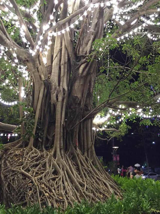 天渐渐的黑了下来,水面依旧是那么的脏,都说萤火虫生活在脏乱的环境中,船到深处,天色已晚,伴着船上马达声,渐渐的可以看到树上一闪一闪的亮光,那就是萤火虫。