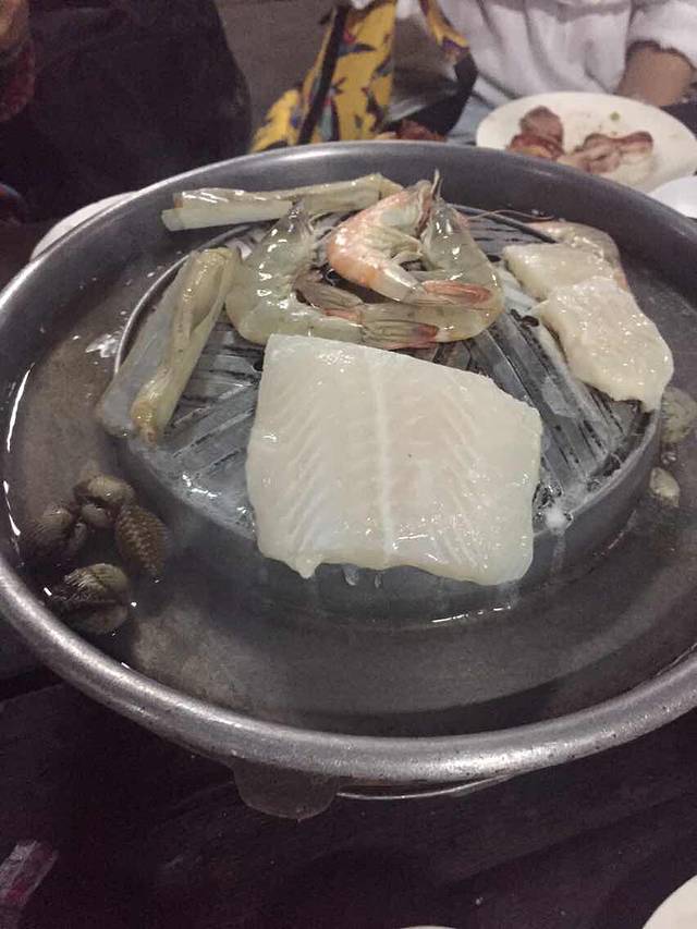 火锅属于泰式锅,中间可以烤东西,周围涮东西。入座,拿菜🍆拿肉🍖拿海鲜🍤拿水果🍉拿甜品🍰,美哉😻