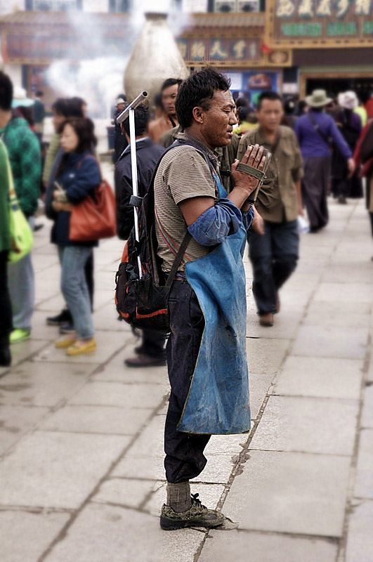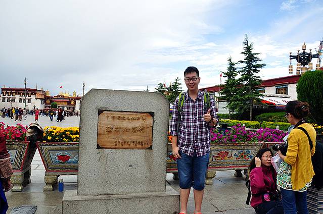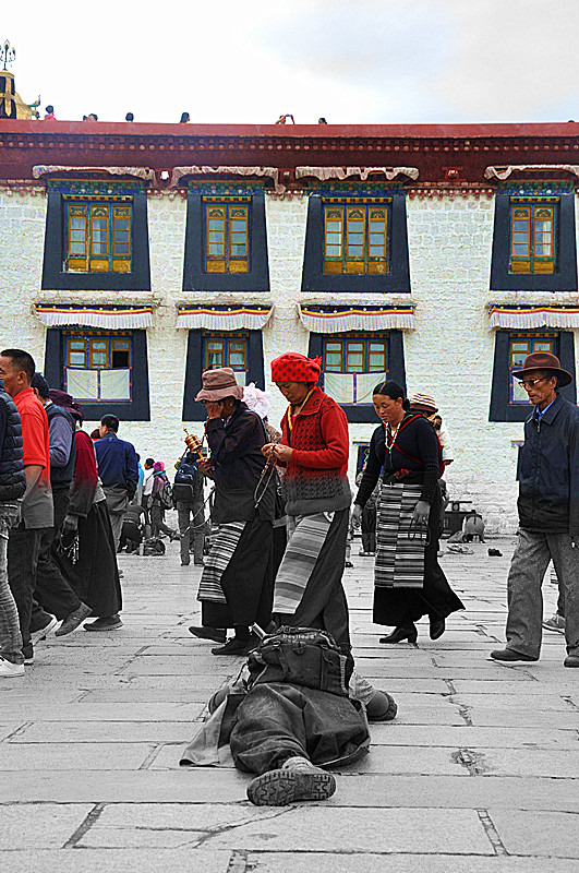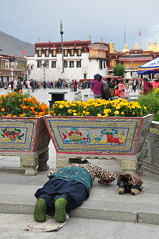 就在这个时候,一个藏民进入到我的视野,一跳一跳的来到了大昭寺旁,双手合十字,磕下再艰难的起来,再重复。或许他是一个贫苦的人,或许他在祈求他的生活会得到庇佑,没有人知道他在想什么,但所有的人都希望,他能够实现自己的心愿,因为他的精神感染了我们每一个人。这或许就是这座城市带给我们这些从外地来的游客一种说不清的,魅力吧。