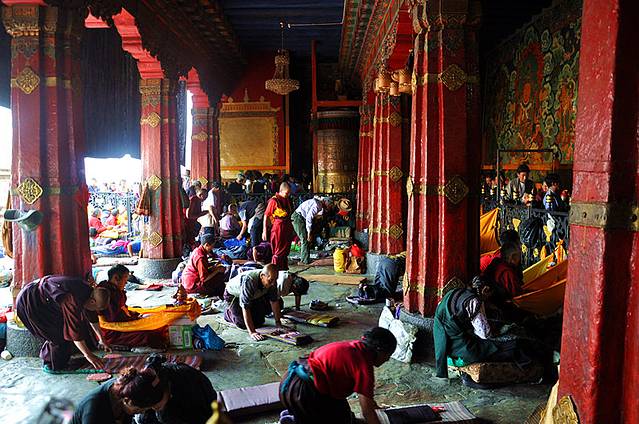大昭寺二层有专门卖开光的护身护佛珠,可能因为在大昭寺内部又是开光的名义,要价比较高,买的人当然也络绎不绝。鸡翅木的手串要100多,小叶紫檀没星没棕眼也四位数,价格翻了好多。所谓的开光就是拿佛珠在柜台后面的佛像那转一下,也不念叨,一点都不是正经的加持,亵渎这神圣的地方。