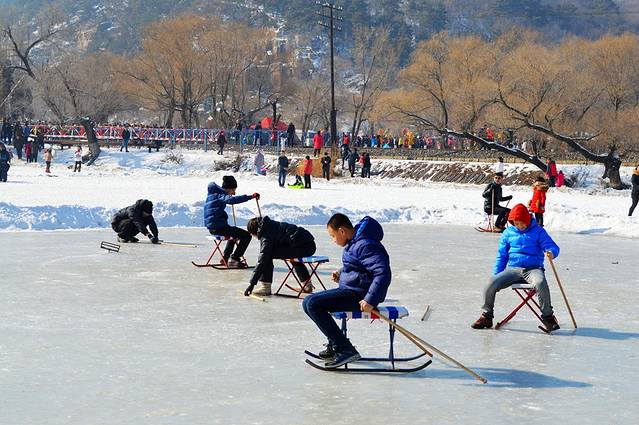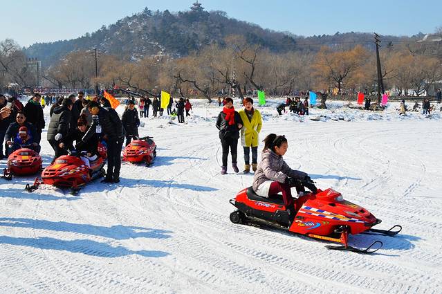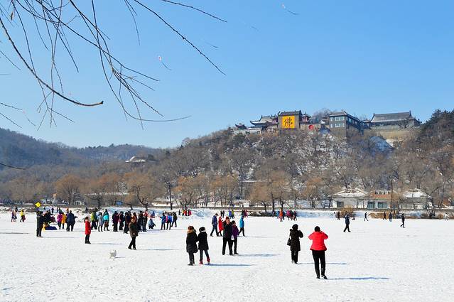北方的春天不同于南方,按我的理解应该属于冬末阶段。北山脚下的莲花湖与泛舟湖依旧冰封,人们在上面参加各种冰上娱乐项目。