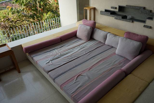 阳台的休闲床,孩子玩得很高兴,要是在这里看书应该也是很文艺的。