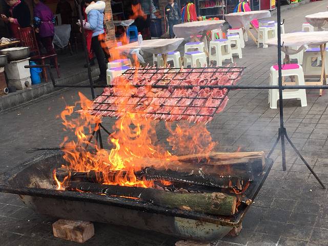 小镇上有条美食街,挺热闹的。吃了唯一一家火盆烧烤,味道听话,牛肉老,排骨好吃,火盆烤兔蛮好吃的、人均消费90元,点多了,剩下很多。
