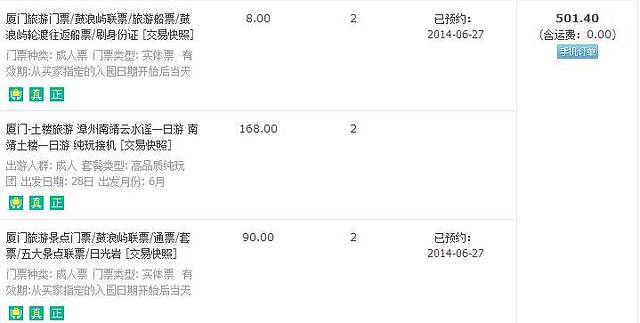 淘宝购买了鼓浪屿门票+联票.土楼一日游.方特游乐园一日游.