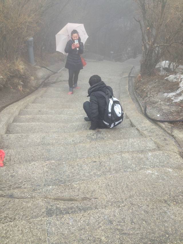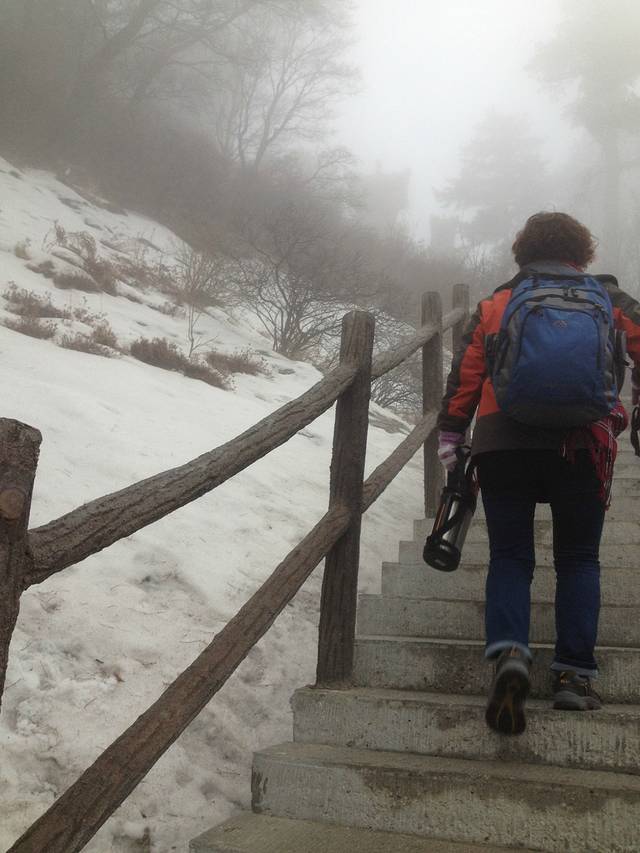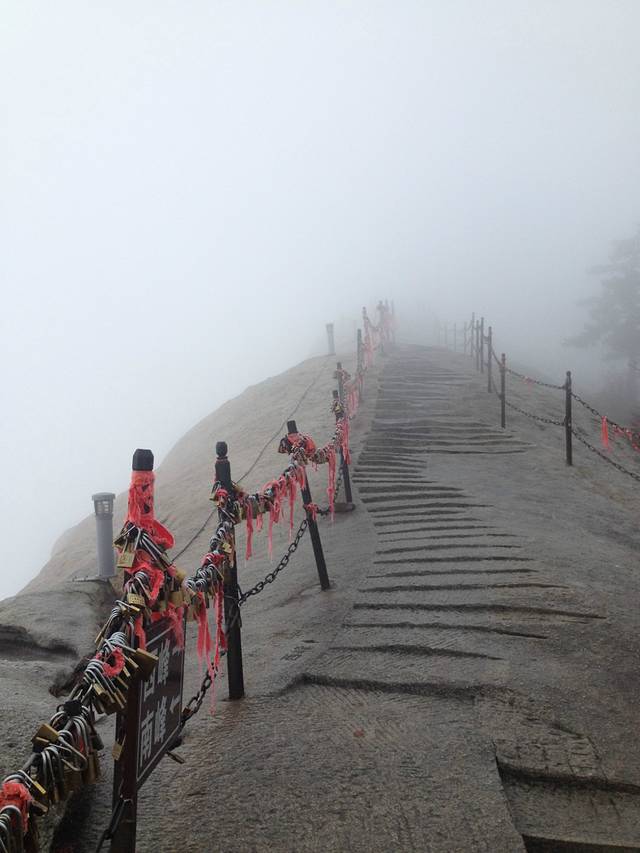 第二天,这个房间的很多人说去看日出了,就起床朝着东峰走了,但是,日出概率只有15%,我也不想去东峰了,想省点体力爬南峰和西峰,路过金锁关后,和去东峰的人在一路口风道扬镳。天气很阴冷,时不时有小雪花,我们路上也见不到其他人,都觉得很恐怖,走着走着,见到前方有正在休息的情侣,我们便一同前行(华山好容易搭讪,找到一同前行的人)。小雪花变成大雪花,路面开始有点结冰,景色也看不见,能见度很低,连头发丝都能变成白色,脖子上的围巾都开始结冰。我们一起参观南天门,此时是8点左右,我们成为第一个进入南天门的游客,大家都想走走长空栈道,发现道路太滑,不开放。生命最重要,不走就不走吧,努力地瞄了一眼栈道方向,底下雾茫茫一片······这位置又结伴一位重庆男人,我们5人行,走过南峰,利用自拍杆在南峰合影。路面越来越滑,可以滑下去,拼命拉着铁索,华山要变成“滑山”,情侣的男生一路滑了3次。我们南峰后就去西峰了,选择索道下山。用时3小时,索道会在半路上停止,关键摇晃,晃得我有点晕,接驳车也是山路18弯地开下去,终于,我在玉泉院附近吐得干干净净。