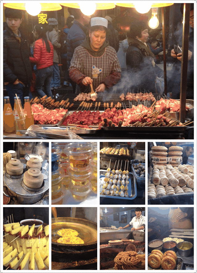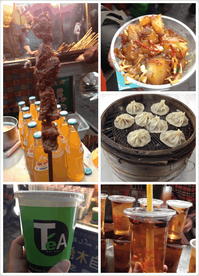 玉泉院附近,前往西安火车站的班车在工作,赶紧上车,等了一小时后,车开了,用时2小时30分钟到达西安(35元一人)。赶紧找预定的酒店,整顿完以后都是傍晚了,就在附近逛了回民街和钟鼓楼,感觉好累好累的,人也好多好多的。吃的基本就是如图类型,我觉得羊肉串和羊肉泡馍比较好吃。