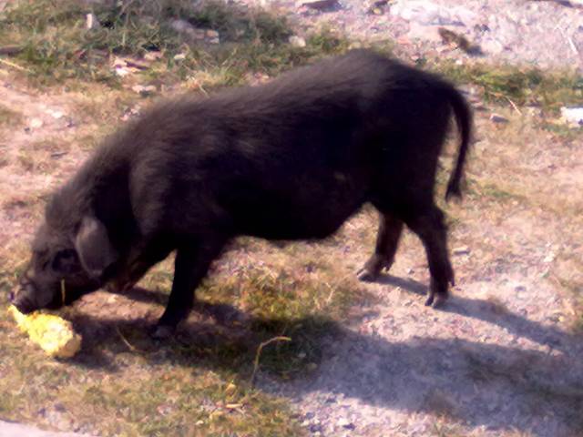 去完虎跳峡,开车的师傅推荐我们去森林公园。一到森林公园门口,黑猪好像是放养的,游客把吃完的玉米芯丢给它。