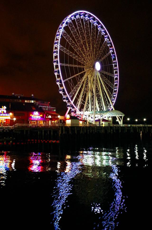 下午5点到了以后就去住的地方Check in, 安顿以后就出门在Market附近逛逛了,在Pike Place Market附近,还有一个人潮涌动的地方就是传说中的第一家星巴克。星巴克发源于西雅图,在Pike St上这家是连锁以前的,所以商标啊什么的都是咖啡色的,而不是现在看到的绿色。午去的时候人是真多啊。。。尤其是韩国人。。。所以第二天大清早又去补拍了一张。作为有手机星巴克City Mug的人最不能错过的就是这件独一无二的city mug,全世界只有这家店有卖哦。所以对于咖啡粉,还是很有参观价值的。不过里面的咖啡。。。不敢恭维。在Waterfront一带除了Pike Market上的一些小店以外,不远处西雅图的摩天轮也是值得在夜晚一试的。虽然摩天轮不是很大,但是一次可以转3-4圈还是比国内很多只转一圈的摩天轮更值回票价|||.当然也可以看到,比较完整的Downtown附近的夜景,包括远处的Space Needle。所以推荐晚饭后散步用哈哈。