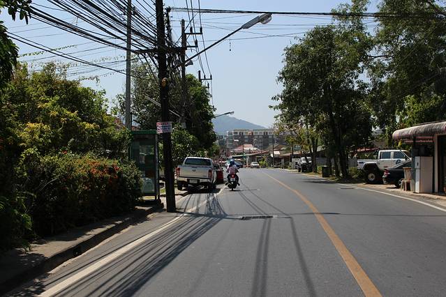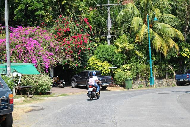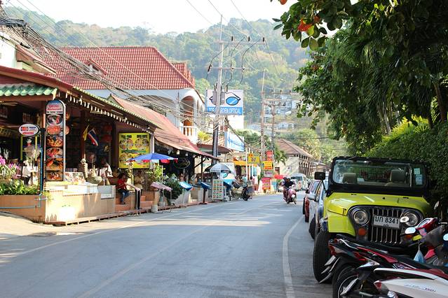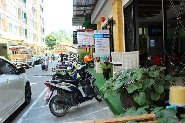去瀑布兜了一圈,虽然瀑布没看成,但是大伙儿都觉得今天会是很有趣的一天,因为有小摩托。啊哈哈,但是接下来去哪儿呢?度娘说普吉镇的路开摩托不合适啊!!管他呢!去吧!!!咱不怕!终于还是骑着摩托去了,其实吧这山路虽然有点起伏,但是还是很好走的,而且在泰国,开汽车的都会让骑摩托的,很有礼貌。虽然看起来马路上很乱,因为摩托好多。终于在中午时分到达了普吉镇,但是去哪儿吃饭呢?骑过去看吧。在一家人比较多的餐馆门口停了下来。没错就是下面那家。