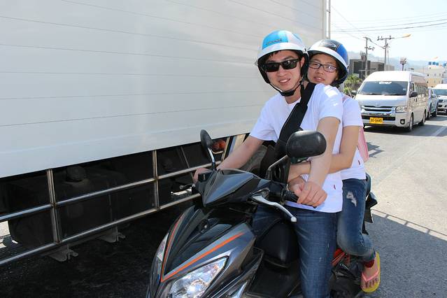 本来第二天的行程安排的是离岛一日游,但是酒店说没有了,只有第三天,因此第二天的行程只能和第三天交换了。早上起来先定摩托,但是酒店的摩托已经定完,没办法,找了对面酒店的,对面酒店叫At home, 知道我们不住在那边,住在对面有点惊讶的样子,但是泰国人都还是很亲切啊,叫我们回国一定要好好宣传他们酒店,啊哈哈,at home,小伙伴们,听到了吗?租个摩托不贵,一天来算250泰铢。我们自己酒店还要300呢,他们还便宜呢。四个人租了两辆,中途加过两次油,一次40一次50,但是其实我们可能只加一次也够的。我们也算是环了普吉半个岛了。讨论了下,看了下地图,最终决定第一站去那个什么瀑布。本想直接去普吉镇的,但是度娘说骑个小摩托不太合适,那边都是山路,而且很远,要几个小时来着,所以现决定去了瀑布。