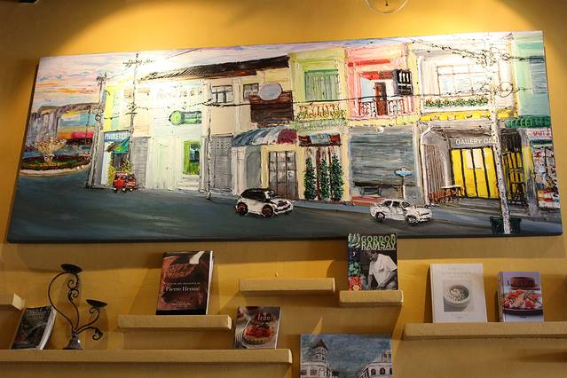 吃完饭,我们还是随意开着,但是一不小心竟然好像出了普吉镇了。于是姐又开始导航,当时由于比较炎热,有人说为什么不去看普吉镇的古建筑,说实话,我们对古建筑真没兴趣,莱普集镇的目的只是为了随意看看,喝个下午茶,所以我就随意导了家咖啡馆去喝下午茶。但是不幸啊,导航上出来的那家店是敞开的,没空调啊!!!还好对面还有一家是关着门的,好,停好车就去了这家店。这家店的位置,你可以看这幅油画,上面有个刀叉的地方就是这家店啊,叫啥名字么不好意思我们也没看。
