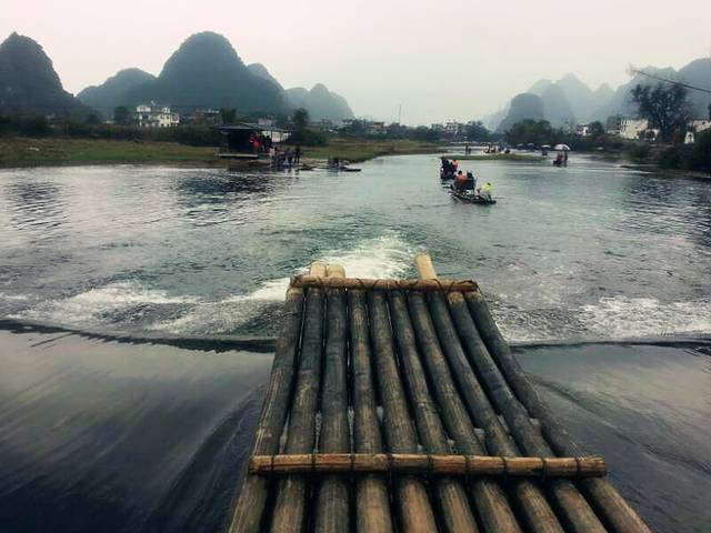 下午我们去的是遇龙河上游的竹筏漂流,据说是上游比下游漂流,如果很喜欢山水的朋友选上游也行,如果觉得都差不多的就去下游感受一下,因为去的时候,上游是330一个竹筏(客栈预先订的,春节假期是有点小贵的了),下游是150左右(如果没记错),一个竹筏只能容纳2个人,我妈现场去的时候讲价讲到270一艘。但是要注意有些筏工可能态度不太好,我在竹筏上和筏工探讨了一下这个问题,筏工这么跟我说:我们也是赚钱,大家都是人,你来这里玩,我很开心,你怎么对我,我就怎么对你,我们就当交朋友。 过去筏工也遇到一些乘客自己动来动去掉了东西然后要筏工索赔,说是筏工故意颠他的。我只希望大家友好相处,不会游泳的朋友不要在筏上乱动,全程2个小时左右。我和我弟和那个筏工叔叔聊得挺开心的。