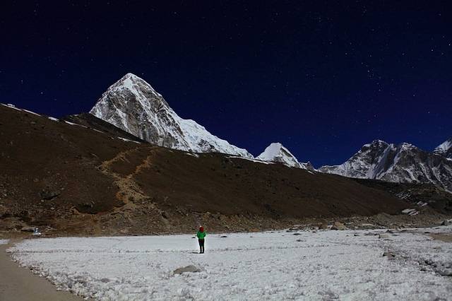 Gorek Shep之夜,皎洁的月光让黑夜里充满了光,洁白的雪山显得那么的神秘
