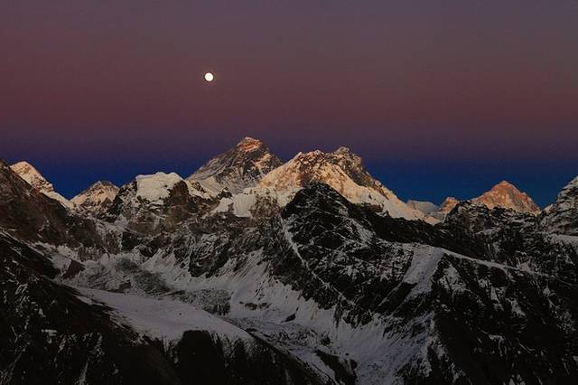 在Gokyo RI看日落十分的喜马拉雅群山。太阳刚刚下山,满月刚出来之际,天空出现魔幻的蓝紫色,美的是那么的不真实,我真想让时间就定格在这一刻