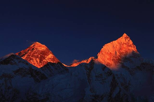 EBC环线中最重要的观景点Kala pattar,左边是世界第一高峰珠穆朗玛峰,右边是努子峰
