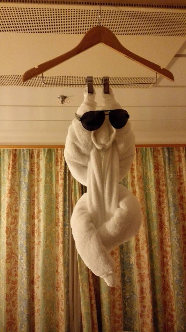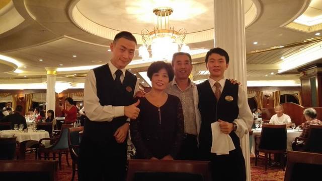 最后一餐,我父母还特地跟他们拍了照,这几天在船上的晚餐都是这两位来自中国的服务生提供服务的,右边的小伙子来自重庆,89年的。今天是他上船的第二年。他的工资蛮高,听说年薪大概由25-30万左右。不过在船上工作是非常辛苦的,每天都要工作十几小时,而且欧美国家的邮轮对于服务水平是相当高的。晚上基本上都是10点以后才回到房间。船上的生活也很苦逼的,没有什么娱乐活动,最恼火的是一旦开船,海上是无法收到通讯信号的,跟家人的联系也就断开了。