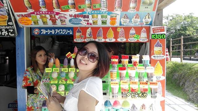 终于被我看到卖吃的啦,看到这里的冰淇淋很多日本人也买来吃,我也去尝一尝啊!价格不便宜哦,一个蛋卷双球冰淇淋20元人民币,快赶上DQ