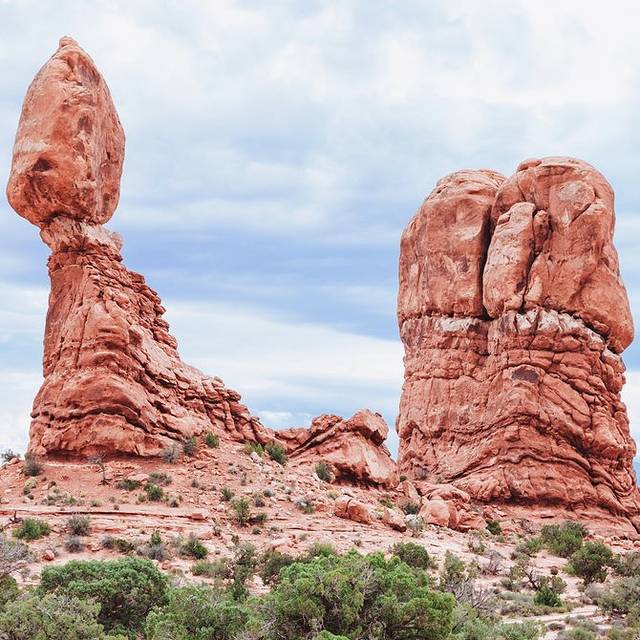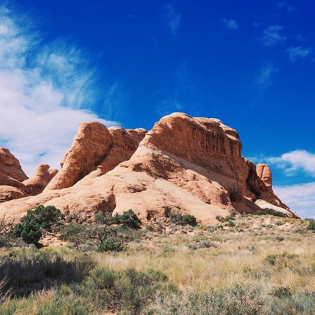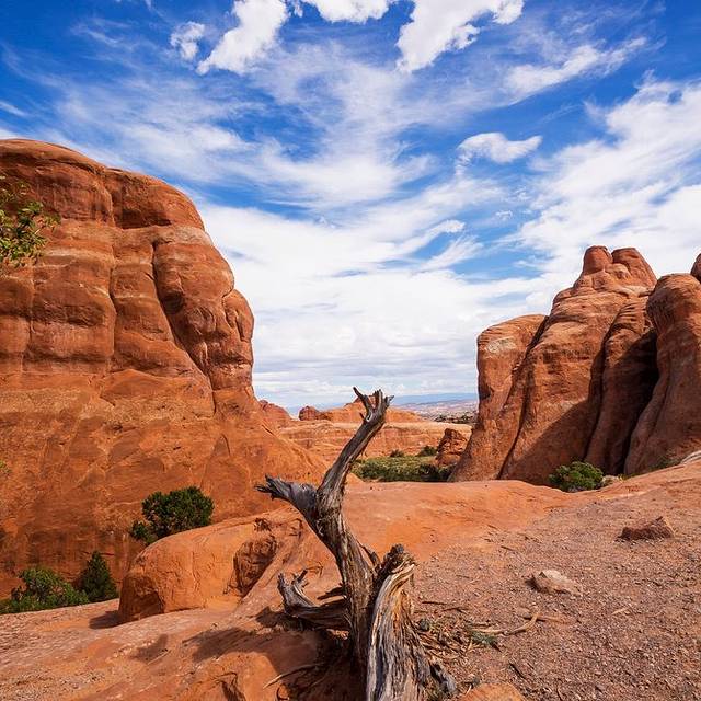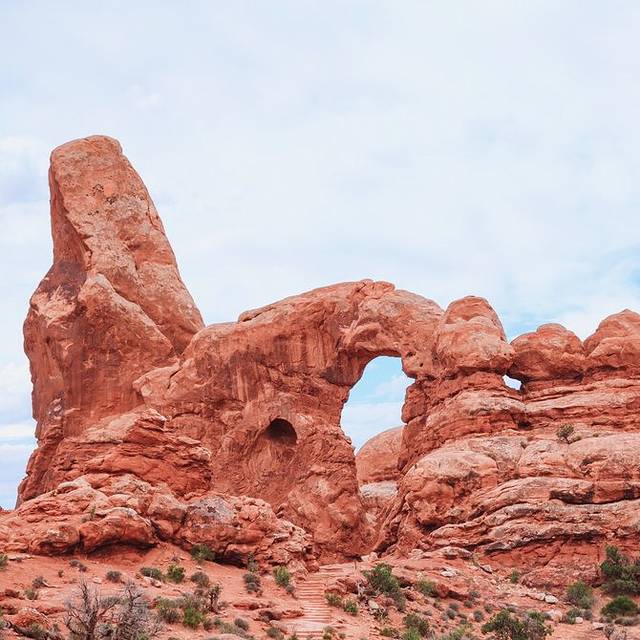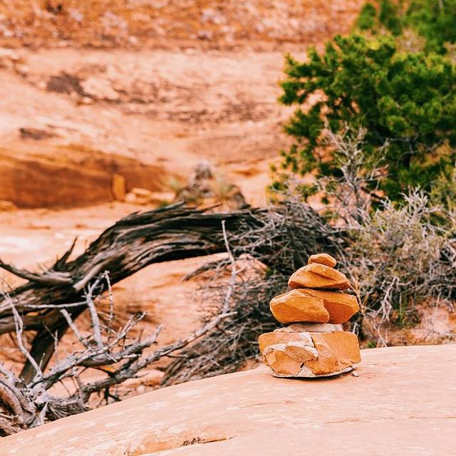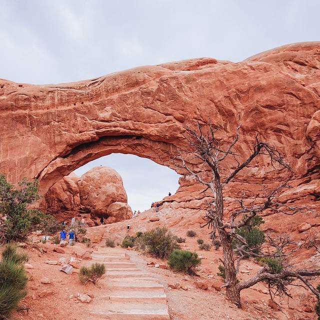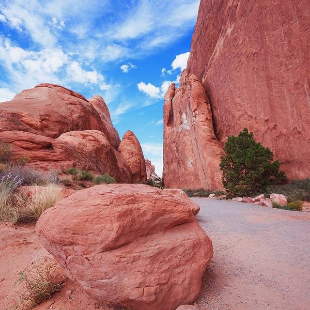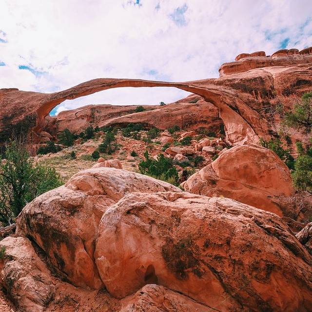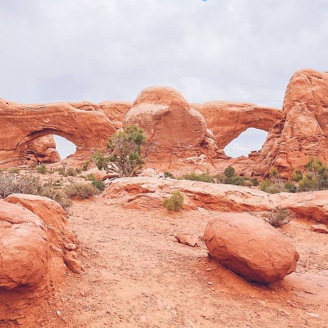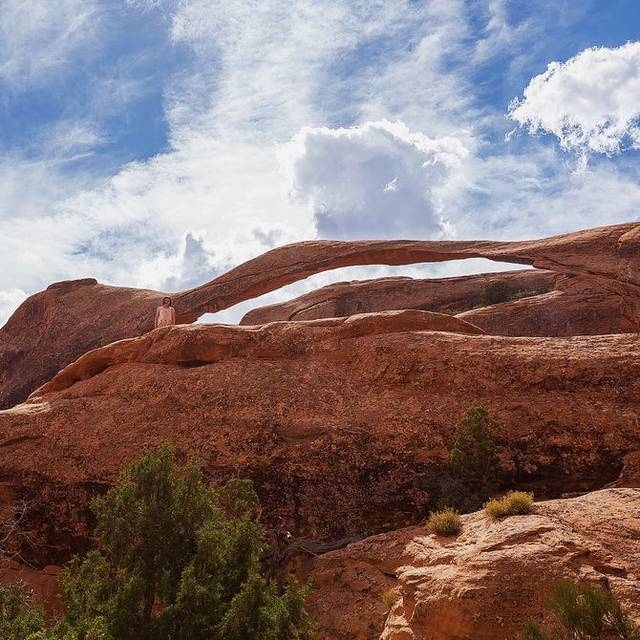 第二天的计划依然继续是拱门国家公园,本来我以为昨晚的经历我已得拱门精华,毕生难忘,今天因为要赶去盐湖城,又是5小时赶路,所以我就草草游览一下就好。早晨就下起了淅淅沥沥的雨,破坏了我们早起迅速刷景点的愿望,也许就是冥冥之中的安排。到了9点开出太阳放晴,我们出发了,这次先是平衡石,南北窗,然后再到魔鬼花园看landscape arch,很多人都是看完landscape arch就折返了。我们本也打算如此,因为来回徒步魔鬼花园毕竟需要5个小时,我们赶不及。在门口遇到了之前联系过的群友MM,MIUMIU,她和友人已游览完打算赶往盐湖,我问MIUMIU,landscape arch远吗,她说15分钟吧,还能远眺DOUBLE O ARCHENS。于是我和老公便打着来回半小时,远眺DOUBLE O的美好愿望出发了。的确看到landscape arch大概花了20分钟的样子,但是我们一直没发现DOUBLE O啊,想着可能再爬上去点吧,就继续往上,怎么1个多小时过去了,依然没看见呢。MIUMIU该不会搞错了,根本没看见吧。路上同行的游客越来越少,怎么办,到底是继续往前还是折返赶到盐湖城呢,我望着老公。老公说让我做决定吧。因为之前大峡谷的遗憾,没有徒步爽,加上我已经走了两个小时了,真的不甘心啊,就拉起老公的手,上吧!大不了开夜路去盐湖城。老公说OK!我们两个弱智儿童就又满血复活开始加快脚步上山啦,不看到DOUBLE O不折返!尽管这才是一半的路啊。