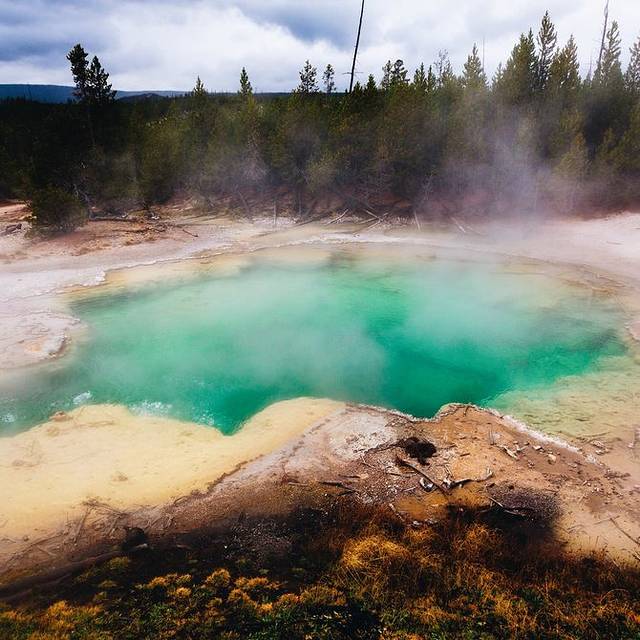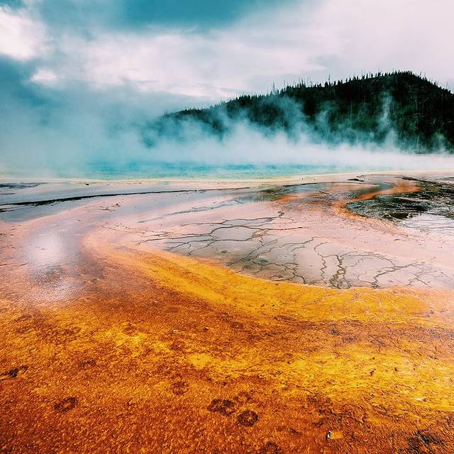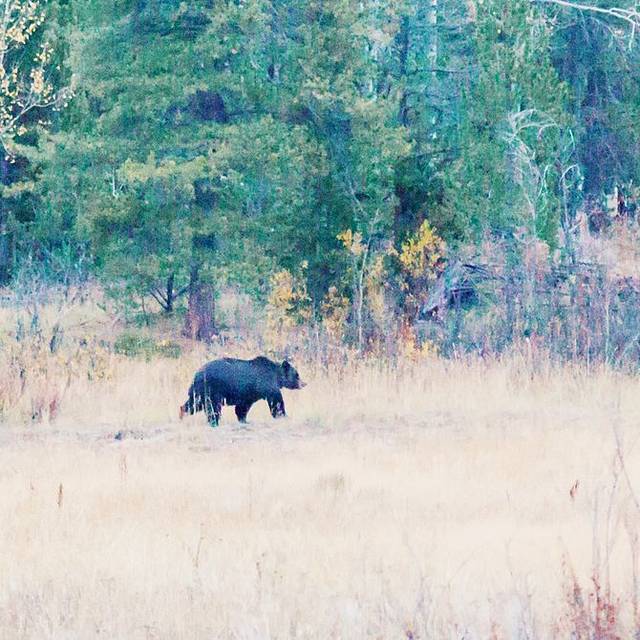 开在TETON去往黄石的道路上发现有两辆车驻停,以前辈经验判断,啊,有动物!也就以为是只鹿什么的吧。结果却发现是只小熊在路边草丛里慢吞吞走路。近距离这样毫无屏障的亲眼看到熊,也顾不得害怕了(其实没有觉得危险,熊出没看多了),就这样和它两两相望。天气阴沉沉的,小熊似乎也无精打采,被我们欣赏了一眼就走到森林里去了。