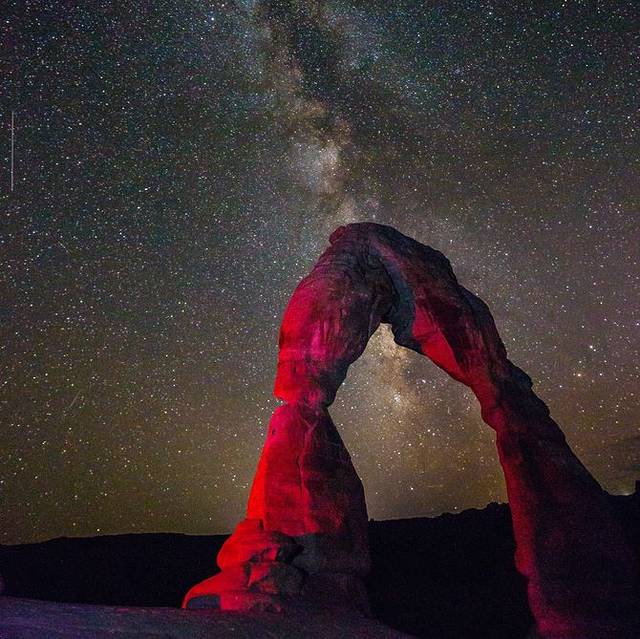在精致拱门边的大石壁上亲眼目睹这么近的银河,竟然觉得心很寂寞,也很自由,这么矛盾的思维碰撞。远离了城市,没有了喧嚣,静谧里的大自然,白天的游客散去,仿佛露出它真实的模样。黑暗里的精致拱门显得更加壮观,巨大,矗立在悬崖边,好象深海里动物,看着有点可怕。突然一个人又把白光打在它的身上,噗,我就想笑,拱门一定在想:尼玛,晚上我也不能休息下嘛。
