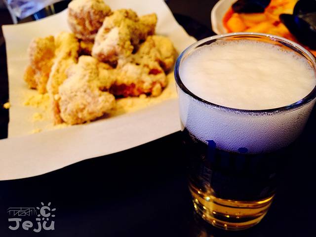 出发前有韩国的朋友推荐说,济州必吃的有黑猪肉,煎带鱼,当然我们也品尝到了正宗的韩国烤肉(当地妹子推荐,如图)、黑猪肉(在步行街吃的,正宗还有待考察),另外要隆重推荐去吃炸鸡,我们去的那家在步行街的街口,距离新罗免税店不远,叫BBQ Chicken&Beer,老板介绍说,BBQ是韩国很有名的连锁品牌,有炸鸡啤酒店,披萨店,咖啡吧等等,味道………绝对很棒(见下图)!我们4天时间,去了两次!你懂得!