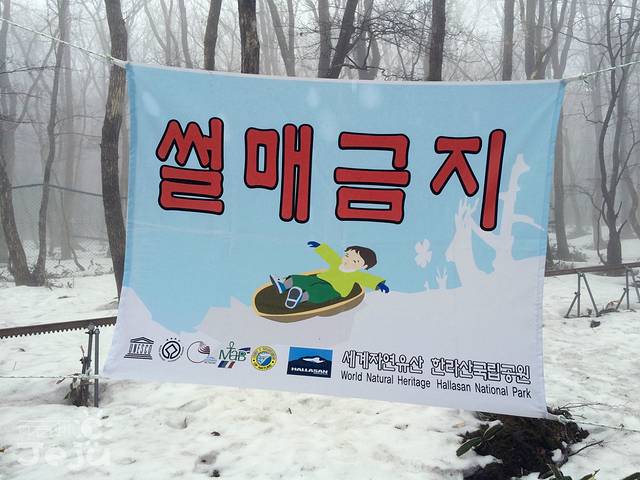 从入口开始,就大雾弥漫,积雪成形。图为入口处拉的标示横幅-世界自然遗产汉拿山。