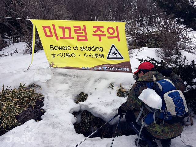 我跟你一样,在没来济州之前或者说在没有了解之前,汉拿山就是一家餐厅的名字,普普通通。因为济州之行,汉拿山让我重新认识,他是济州的最高山,是韩国的最高山(三大名山之一),也是济州的重要符号,海拔1950米,是我此行必去之地。去之前我以为它像长沙的岳麓山,去之后发现没有印象中岳麓山的绿,而是有点“野”味的积雪山;去之前我以为人流很大,热热闹闹的同行,去之后却发现特别的安静;去之前我以为会像去华山一样沿路有一些居民售卖果蔬,其实却不然。所以,汉拿山之行多了更多未知的缘分,全程道路几乎被雪覆盖,山间雾气之大能见度最短时不足100米,听着已经湿透的鞋与雪面的碰撞声,及全程能够听到的乌鸦叫声(心想在国内乌鸦可不是什么好象征,百度才知道乌鸦在韩国是代表吉祥的)完成了两条线路的计划,同行的朋友感叹此行确为一次“洗肺”之旅。