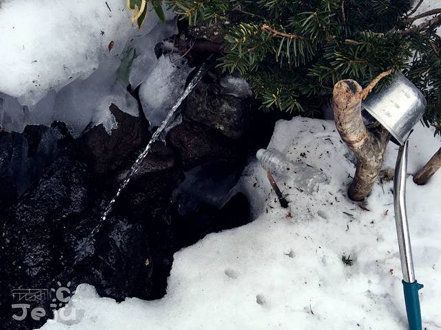 快接近1500米时(约)碰到更多的行人,和汉拿山泉水,泉水旁边放着一个公用的铝瓢供游人使用。