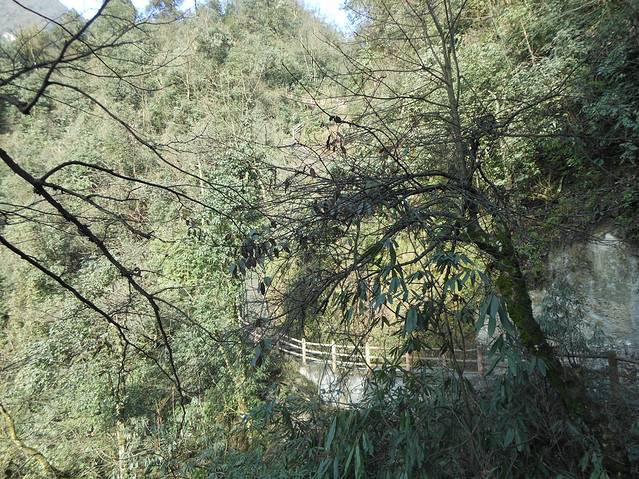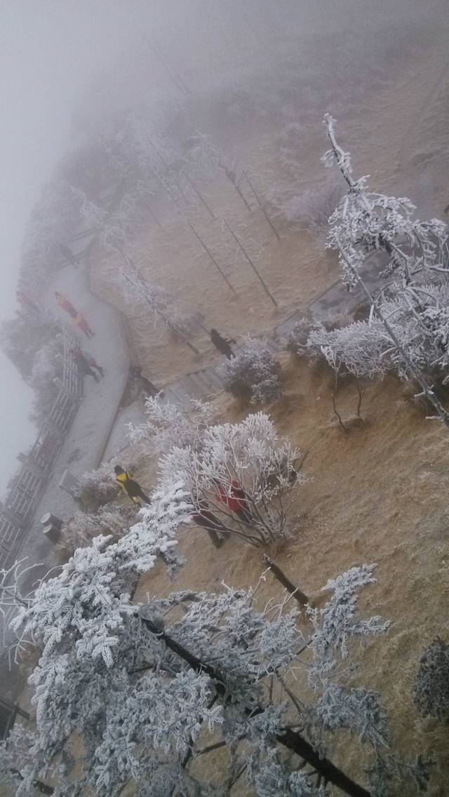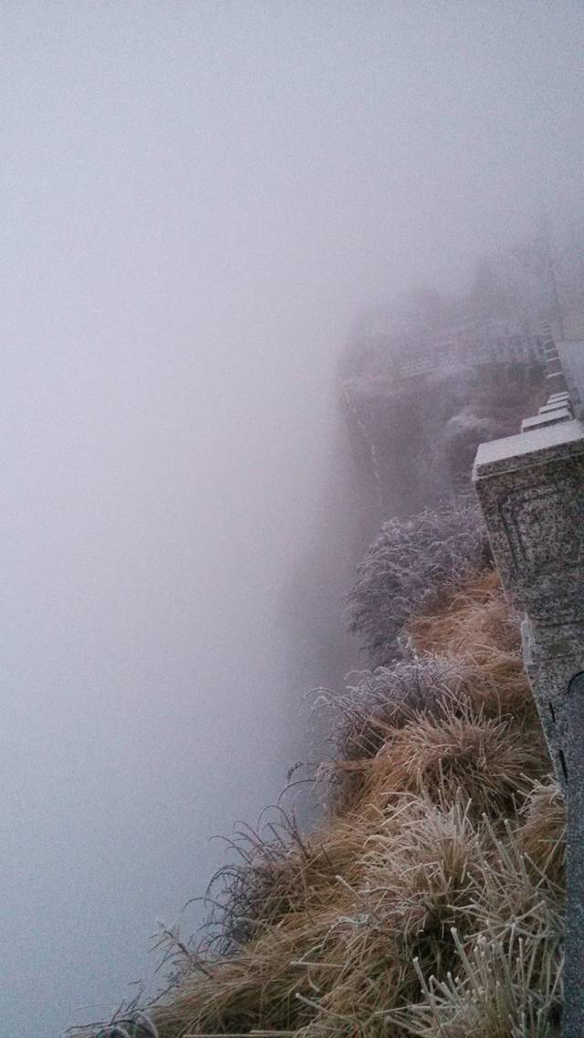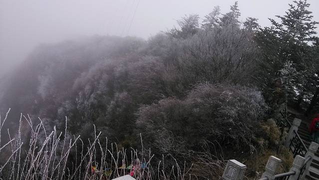 仙峰寺出来一路下坡,一直下到又一个山坳,有是一股清泉,泉水上方是一处悬崖绝壁,高上百米,两岸还有粉色茶花正在盛开,山坳一角还有昨天下的雪,被打扫石阶的工作人员堆到一起。下到山坳里面肯定又是上山的路,前面的山路是在悬崖边上的,前面还好有栏杆,后面一段因为塌方,栏杆都坍塌了,路也不好走。绕过了这山,又开始下坡,还是一个山坳,只不过这个山坳里有一处小卖部,东西老贵,没买,直接上山,遇仙寺就在山上,过来的时候早就看到了,就是一直绕山才能到。这段台阶堪比九十九道拐,随不是那么长,但是它的台阶太高,非常陡,个人认为可以和九十九道拐相媲美。上去用了半个小时到达遇仙寺,我连寺庙的门都没有进,就在外面站了会儿,又得跟进大部队的步伐了。中午十二点左右到达九岭岗,因为到了九岭岗就是这边山头的顶端了,接下来就是平路系列,绕道另一座山前面,正好有一个小卖部,上面写着:此处钻天坡。抬头一望,和九十九道拐差不多,而且坡还要长,更陡。总体来说钻天坡没有九十九道拐长,用了两小时爬到了洗象池。洗象池门扣,一对情侣,女的被猴子捉弄得直掉眼泪,四五个人站在路口不敢走,我们三个男生加入后组团过的(据说猴子爬到她头上来扯头发,赶猴的竹竿也被抢了,包也被翻了,她的男朋友也被猴子划伤了)。过了洗象池天气已经很冷了,从下山的人口中得知,再过不远就可以见到雪了。我们信誓旦旦的继续上山,这一路上没有见到猴子,本来四周都没有雪的,然后路边的树林里出现了雪,接着路边零星的有雪块,再然后路面上有一些冰(下山的人和上山的人踩了后雪就变成冰了),然后全是冰。特别是在上台阶时一定要注意,冰面滑,摔倒就会滑很远,有时路边是悬崖,这时候冰爪的作用就来了,山下的冰爪5元/双,山上的冰爪10元-20元/双,我们买的三双12元,效果还行,这也是冬天上峨眉山的必备之物。一路上我们还见到了峨眉云海,场面是相当壮观。再上不久就到雷洞坪了。(注意:要到雷洞坪时有一个猴群,这里的猴子应该比较温柔,我看见有专门的人员饲养,也没见它们伤人,倒是见到猴子吃草的样子)。