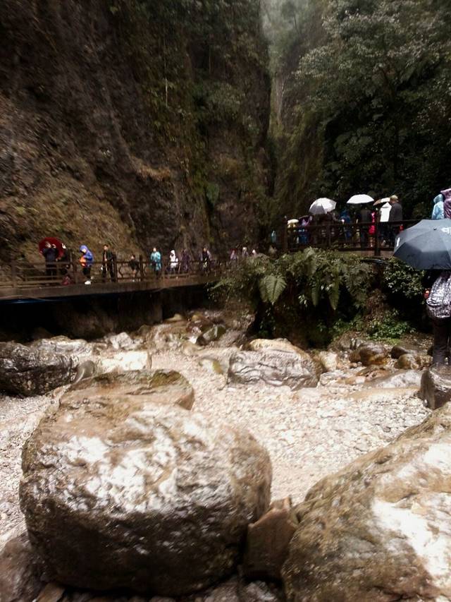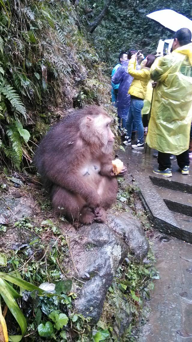 在清音阁我们也找不到方向,没有买地图,看哪儿人走得多就往哪儿走,果然还是正确的,清音阁出来走二十分钟左右到一线天,人流量太大,速度一直上不来,也耽误了我们一行的时间。一线天其实和重庆的金刀峡没什么太大的区别,高山,流水,峡谷,栈道,但是整个一线天太短,没什么值得驻足留恋的。一线天刚刚过完就进猴区,人挤人,路上全是人,到处是猴粮(玉米)。见到猴子得小心了,这里的猴子有人管不至于太多分,但是它们有时也要抢,有人的包被翻了,有的猴子骑到人头上扯头发,有小孩儿的玉米被抢的,也有的猴子拉住人的衣袖不让走的或者和人一起合影留念的,总之一定要注意安全,本人在这里建议大家最好别喂猴子,在山下买一根竹竿(2元/根)趋猴,很有必要。我们一行是三个人,砍下来5元3根。猴区出来走上1个半小时全是上坡路到达洪椿坪(到达时间是下午3:50),因今天在猴区和清音阁耽误时间太久,上九十九道拐到仙峰寺还要3.5小时,根本走不到,而且上洪椿坪这一坡也确实够累,索性就住洪椿坪,住宿费三人间70元/人,条件超恶劣,木板房,外面的走廊面对山谷,稍微走重一点屋里的桌子和杯子开始摇晃,有点吓人。晚饭为素斋,20元/人五点半开饭,感觉不划算,我没有吃。一到洪椿坪,马上开始洗澡,因为越到后面水越冷,房间没有电视,只有床,所以晚上八点就睡了。