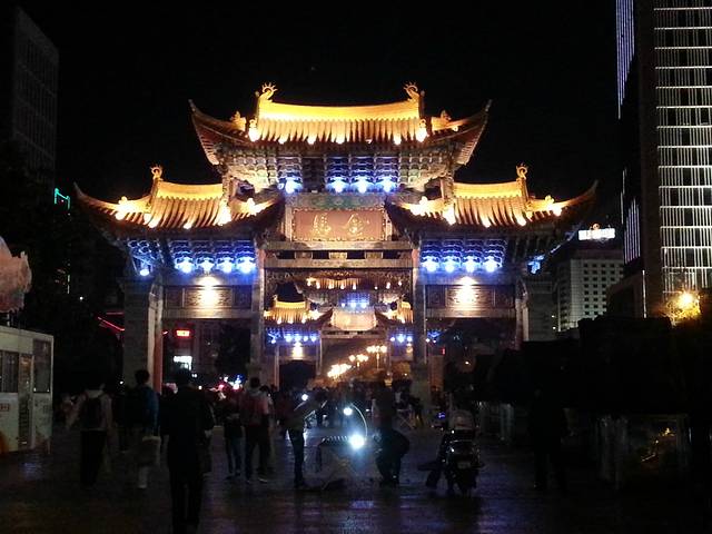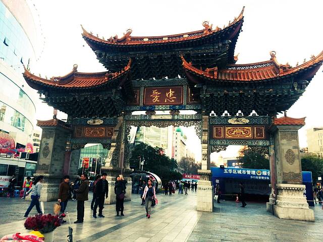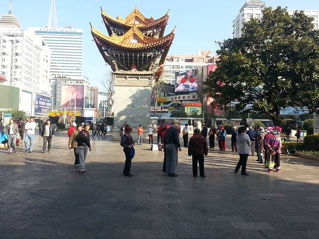 金马碧鸡坊前的广场舞不像广州一样大妈整齐纵横列队,而是围成圆圈形状边唱边跳,其间穿插着少数民族和汉族,情不自禁哼上了“56个民族56只花,56个兄弟姐妹是一家......”