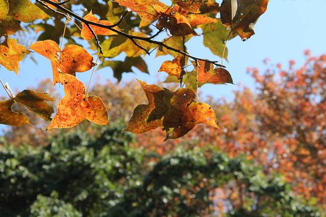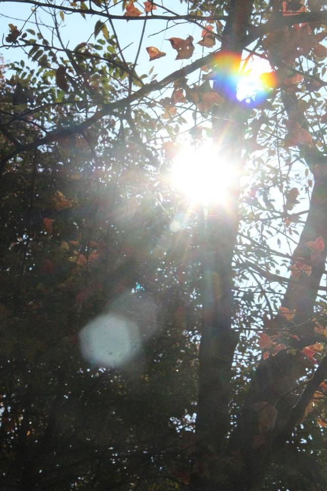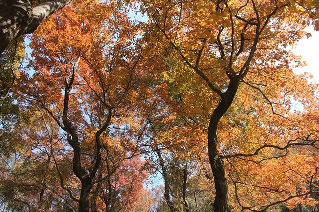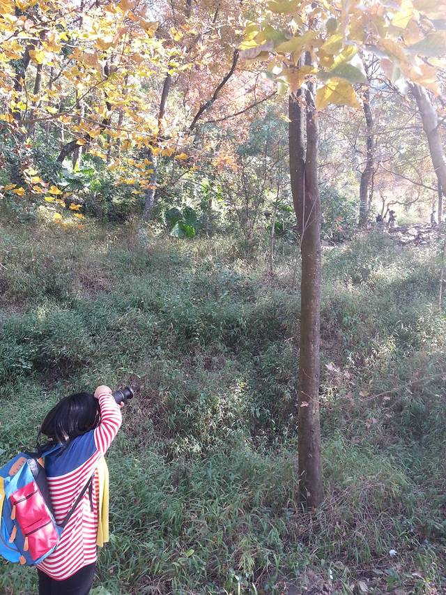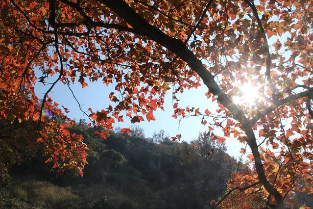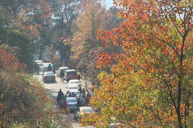 在山道上,看的是山下的枫叶,但是山下的始终没有山上的红,所以还是要停好车,步行上山。