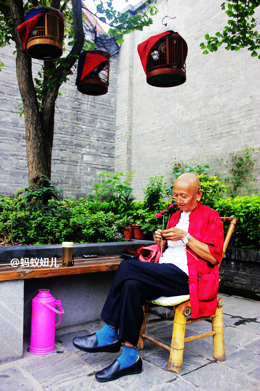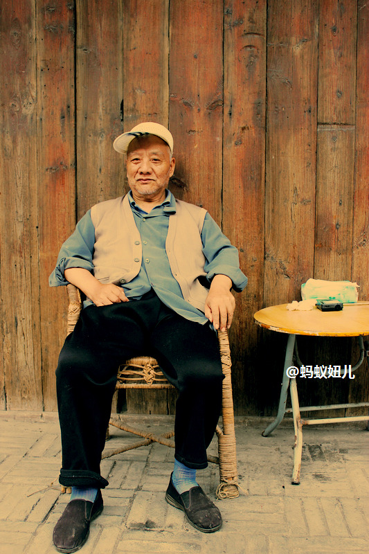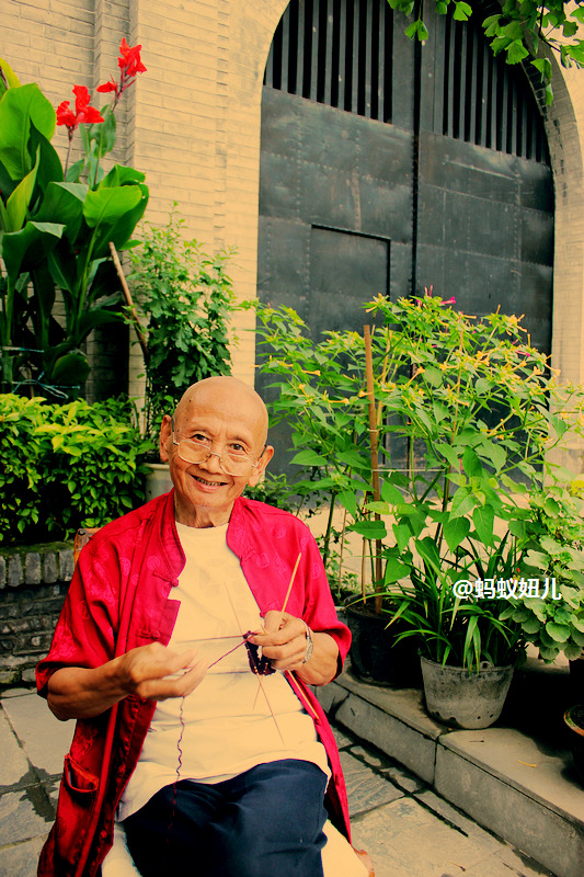 这一张,6月21日拍的照片,整理出来好温暖。一早去老街,看见这位著名的老爷爷在织毛线。安仁中学的后门是他的地盘儿,不下雨的时候他会出来把鸟笼挂树上,休闲专注地打毛衣,这几天再去看他时已经改成了修十字绣。拍照时老爷子很配合,我说会洗出来送给你一张,他笑得开心,说我家还有很多宝贝,带你去看。