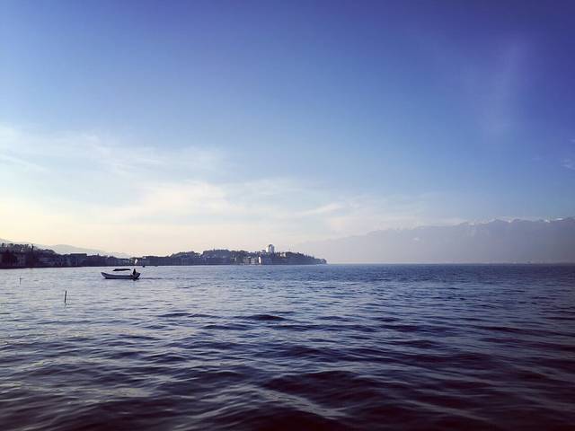 懒洋洋的醒来,耳边是海浪的声音。这时的洱海,宁静得只剩下心跳声。看着太阳从海的那边缓缓升起,一点点的光亮,直到整个阳台被阳光洒满。温暖,和谐,安宁,美丽,这时候只能想到这些词语。用什么来形容洱海好呢。远远的苍山一片,躲在云层里秀气得像一个姑娘。