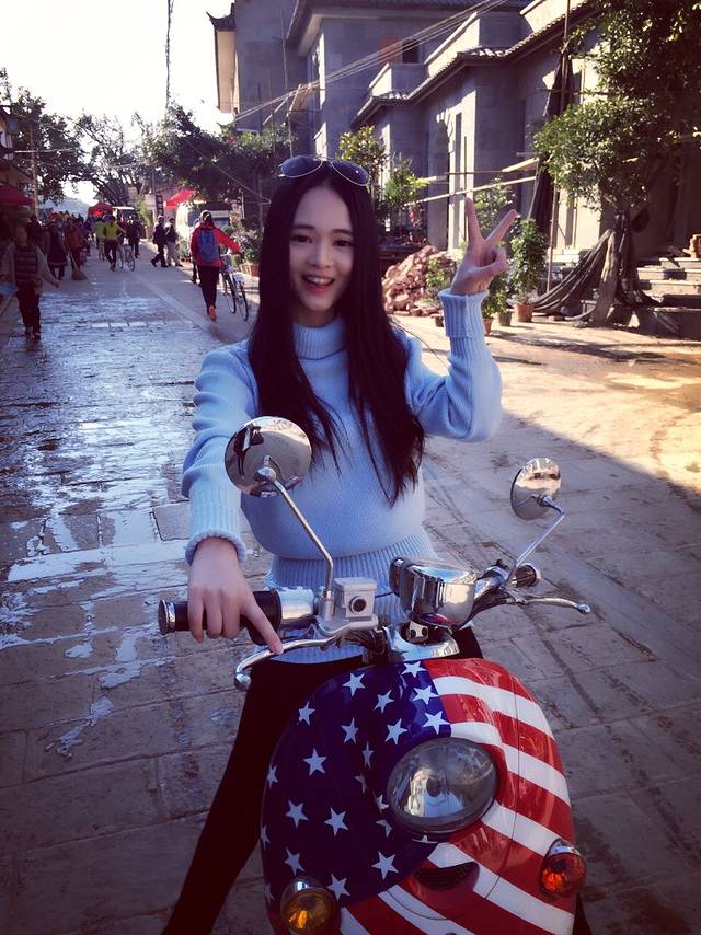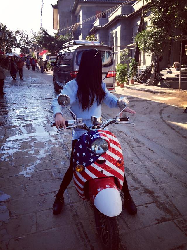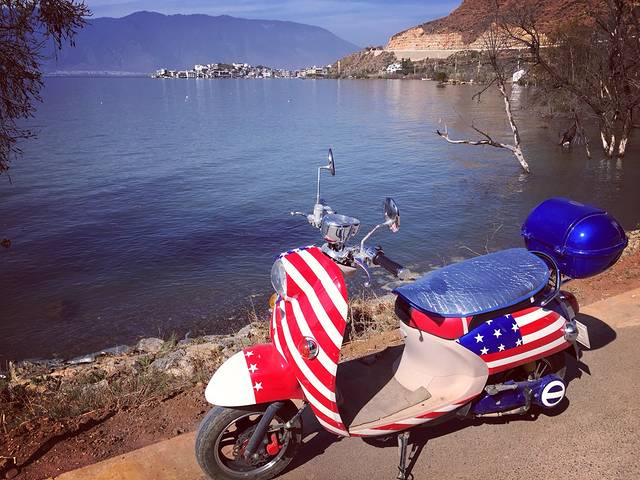 吃过早餐之后(又是一碗米线!),租了一辆电动摩托车(40元一天,押一个身份证,租之前注意看好小电摩是充满电的,并且安全性能高,骑上路一定要注意安全)我载着小思,环湖开始啰。我们也是有车的人!