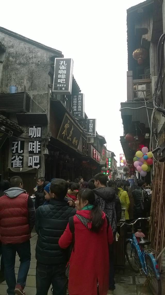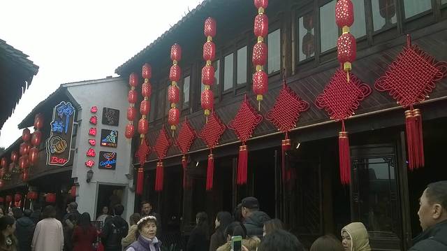 没想到江南小镇人如此之多。西塘与周庄相似很多,江南古镇都一样的,小桥,流水和人家,水上桥桥下水,水绕镇镇围水,船在水中,屋在水上,桥连街街依桥,融为一体。区别在于烟雨长廊,河面宽广与现代文化气氛浓厚。西塘的热闹在塘东街,西街与烟雨长廊和另外原住民特有风格。塘东洒巴街由于一盏明珠照耀,现代文化气息特浓特范,灯红酒绿,任性自我,突出古镇都市化氛围,营造浪漫与热烈,古典与现代,古镇与都市有机接合,意味十足;烟雨长廊为了避雨修建的,构成美丽风景线,环河四 周,也促成雨中漫游西塘,看丝丝雨点击打河面泛起,静静思索的场面,周庄也有因失火消失了,这就是独特无一的;河面宽广给人一种大而广感觉,思绪更敏锐,这就是不同。清晨西塘也是宁静和深远的,远远看去如醉如痴,出客栈左手边就是双桥,比周庄更大些,只是没有故乡的回忆让它飞翔起来的,藏在梦中更奇特,右手边行走就是送子来凤桥。烟雨长廊沿河一圈,环秀桥高处可见,的确不可小瞧,两旁商品各色各样,应有尽有,特色商品多如牛毛,有钱没有不会花的。环镇一圏网传2小时太虚了,实际4小时以上,才能体会她的含意,不亚于周庄,虽小也需要感受,各个景点看看蛮有特点,不似网传,定下来可以慢慢享受,只因时间不够,倒愿意享受,再见了西塘,有幸再来看。下午近5点汽车,返回苏州也是夜幕降临,苏州环高架很漂亮,只可惜没照几张照片,下车直驭地铁2号转1号到金鸡湖看夜景,有人说美也美,美景在心中,处处都美,大都市也是这样了,建筑风格和灯光的照耀形成视觉器官美感,倒是水才是生命之源。 凤凰街因年节关系夜幕下冷清,也挡不住外地人探访和本地人光临,商街零零碎碎开了几家,吃货挺多,骆驿不决,我们吃货东北菜,最后离苏州的晚餐。十全街和凤凰街成十字型,故名十全十美,呼唉也。