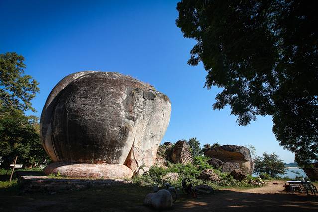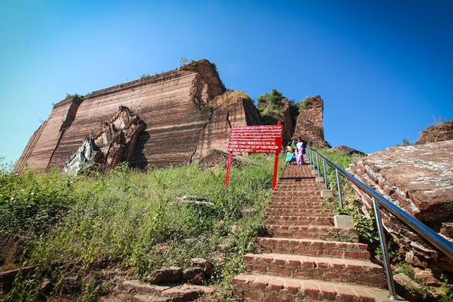 现在的敏贡早已经失去了昔日皇城的气派,就是一个悠闲的小乡村,不过,那高高耸立的敏贡佛塔(Mingun Pahtodawgyi)遗迹,才会令人想起那些曾经的辉煌和繁华,让人感受到震撼。我第一次看到敏贡佛塔遗迹的图片,还以为是一座宫殿或者类似于城门楼之类的遗址,想不到它居然是一座实心的砖塔基座,难以想象这塔要是建成,高达150米的实心砖塔直冲云霄,该是怎样一种壮观的场面!因此,这里是绝大部分到曼德勒的游客都不愿意错过的旅游目的地。