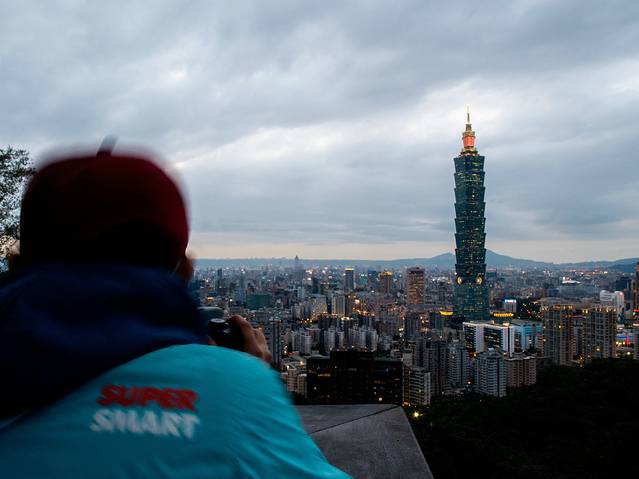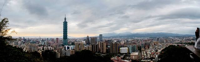 歇了会儿还是坚持爬到了山顶,山顶的位置特别人性化的修了一处观景平台,视野瞬间开阔,上去发现已经有10几个等在那儿看台北夜景的人了,专业带脚架来摄影的还有好几个,这时才5点多,天上又是阴云,看不到夕阳。我随便拍了几张就跟旁边也是等夜景玩摄影的大哥聊起来了,据他说他是新竹人,经常有空就会赶高铁过来爬到象山顶拍101,拍完夜景再赶当天的高铁回去,想想还真是任性啊。看完美丽的夜景,我和颗颗已经快冻成狗了,但心底却都是心满意足的。