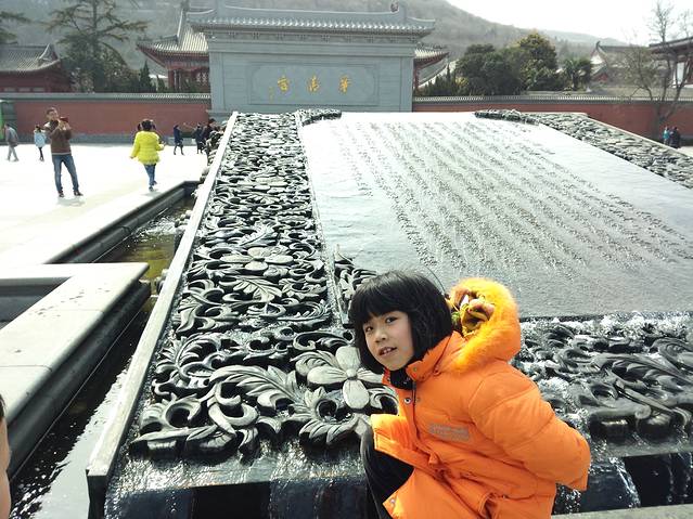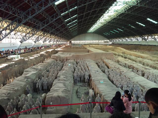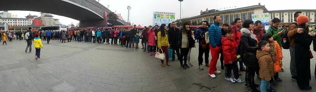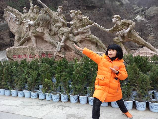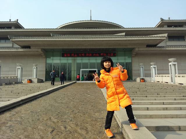 睡到8点起床,下楼吃早餐,自由行真是舒坦啊,9点赶到火车站,西安有2个火车站,一个高铁叫西安北站,一个是普通火车站叫火车东站,我们去的是东站,根据攻略去兵马俑必须坐国营的游5,一到东站西面的广场一看傻了,怎么这么多人啊,游5排队有几百米长,蔚为壮观啊,一边私营的914、915车门口站着浓妆艳抹的大姑像铁道游击队拉着车把手迎着寒风扯着大嗓门:走啦,兵马俑的走啦,可惜没几个人上车,唉,赚点钱也不容易啊。咱还是乖乖的排吧,群众的眼睛应该是雪亮的,还好游5车很多,只排了10来分钟上车了,乘务员劝说先游华清再兵马,因为兵马是回程的始发站,如果游了兵马后到华清等下不一定能乘上车,人满了。所以每人6块(为了舒服点咱土豪了一次,给小孩也买了座位,36块买6座位,谁叫咱有钱呢)。开车上路,堵,就一个字,1个小时的车程足足开了3个小时,1点到的华清池,还玩个屁啊,商量后,在门口拍个照,去旁边的樊记肉夹馍买俩馍充饥直接杀向兵马俑。兵马俑从下车到售票处有一条弯弯曲曲的长路要走,两边是烤肉的、卖杂货的、卖土特产的,5A级景区一点也擦不上边,网上买的和现场买一个票价成人淡季120元,140CM以下免票。进入大门又走了N多路,坑爹啊,走的热死,老婆还让我挡着脱了绕成团的高领,全然不顾光辉形象了。