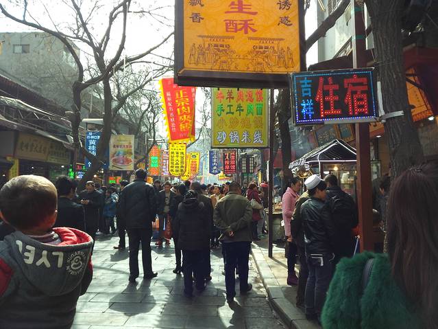 到达咸阳机场已经是中午11点多了,飞了2小时,长龙航空坑爹啊,只提供一盒只够喂鸡的粥,整个吞下去才填满胃的一角,2个小家伙直喊饿啊,六零年代到了。拿到行李直接按路标下机场底楼按照攻略上写的乘机场大巴(西安宾馆线1小时一趟),等了20分钟上车4大2小买了5张票,25一张,一个小时后到达西安宾馆,万能的高德地图指引我们到了秦唐一号,办完入住,直奔回民街。饿啊......