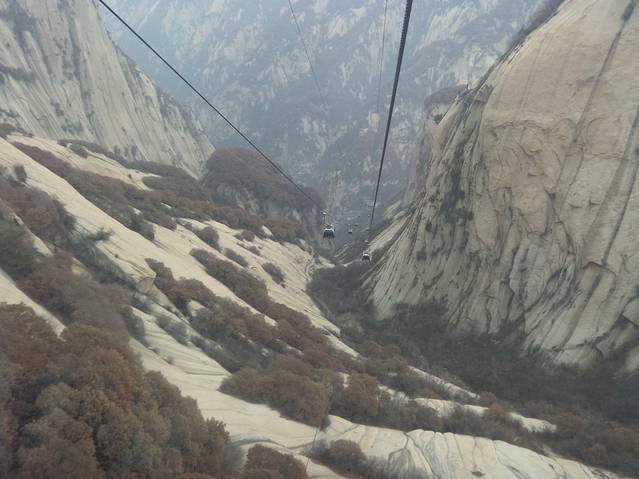 西峰的索道20分钟,先上再下,再上,脚下万丈深渊,黄山的索道比起来简直是过家家。尤其是到了西峰口,由于隧道口大风吹的索道蓝一晃一晃,呼呼的风声直吹耳边,怪吓人的。女儿直呼好玩,够大条的。