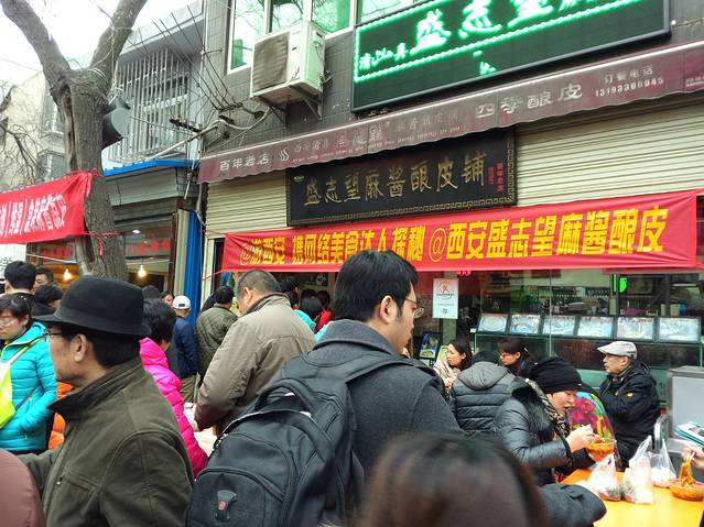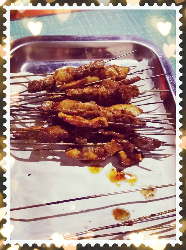 出了酒店,转入钟楼的环形地下通道,分不清东南西北的我硬是拼了人品走到了鼓楼出口,鼓楼后面就到了传说中的回民街,那个人头叫多啊,简直望不到边。人头、呛鼻的烟雾、叫卖声、喇叭声、烤肉的香味混杂在一起,形成回民街独特的风景线,出发前自己绘制了一张美食地图,但到了实地真假李逵到处充斥在街上,让你无法辨认到底哪个才是真的,唉,军军绿豆糕、军军手工绿豆糕、军军绿豆糕坊...而且全都号称百年老店,叫我这个外地佬怎么辨认啊,看来回民还没商标意识啊。看到用树枝串着的羊肉串,好大肉啊,油滋滋的,买,10元一串,6串每人一串,一尝晕死,一点也不好吃,肉老而且有点冷,上当了,所以得出个结论,上回民街不能只看卖相,而且不能一次买多,只能买一点尝尝,好吃再买,而且美食这么多,你同种东西吃多了就无法品尝其他美食了。