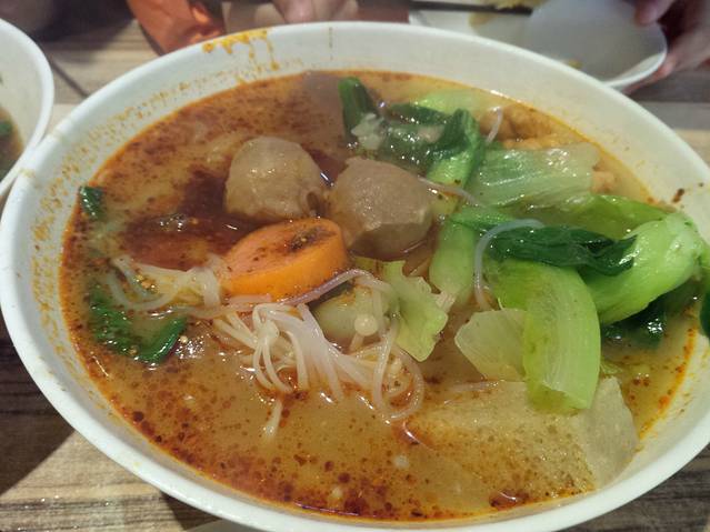 这个真塞饱,饿着肚子一尝味道很好啊,肉香软嫩,一点也没羊骚味,汤料鲜美,好吃,半碗下去,尼玛好腻啊,喉咙口有点痒,再也吃不下了。还分优质和普通,也不便宜啊,优质38一碗。